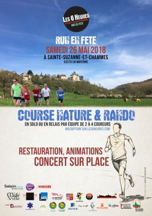 Les 6 heures de Sainte-Suzanne-et-Chammes c’est une course relais et une rando par équipe de 2 à 4 coureurs ou en solo mais aussi une fête avec repas et concert dans le magnifique site classé l’un des plus beaux village de France de Sainte-Suzanne.