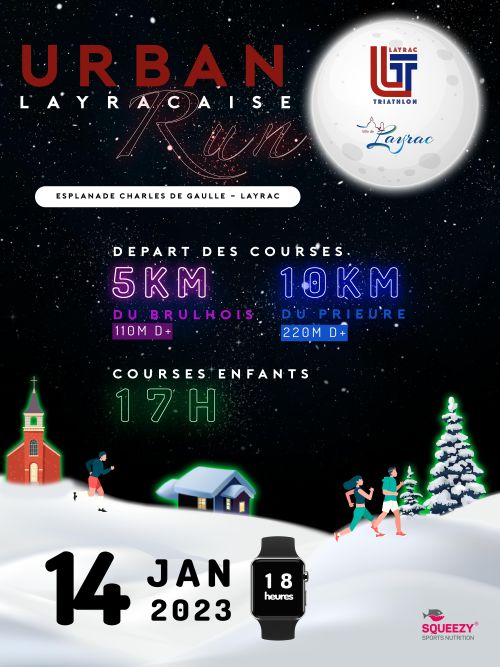 Urban Run Layracaise avec 2 parcours et des courses enfants. Course en semi nocturne, la frontale est conseillée. course effectuée sur bitume (80%) et le reste sur chemins.