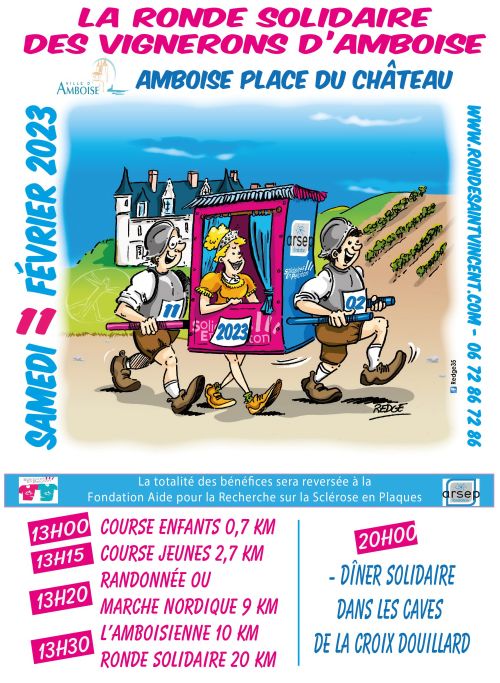 La Ronde solidaire de la saint Vincent est organisée dans le cadre des festivités de la Saint Vincent, grâce au soutien de la commanderie des grands vins d'Amboise et du syndicat des vins. Un grand dîner festif clôturera les festivités de la Saint Vincent. La totalité des bénéfices de la journée est reversée à la fondation aide pour la recherche sur la sclérose en plaques (ARSEP). Soyez Solidaires En Peloton en étant nombreux à partager avec nous ces moments sportifs, festifs et solidaires au profit de la recherche sur la sclérose en plaques (Fondation ARSEP).