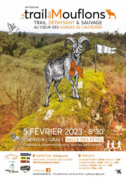 Trail des Mouflons, organisée par le Cacc running. Ce trail de 42km dans les gorges de l'Auvézere permet de découvrir des paysages inédits du Périgord. Le 23 km est non moins impréssionant avec l'ascension du Rocher du Diable. Un 11 km rend accéssible à tous ce trail exceptionnel en Dordogne. Une marche de 11 km et un casse croute pour tous les participants, permettent à tous de passer un trés bon moment ... Alors n'hesitez plus , inscrivez vous pour vivre l'experience unique du Trail des Mouflons...