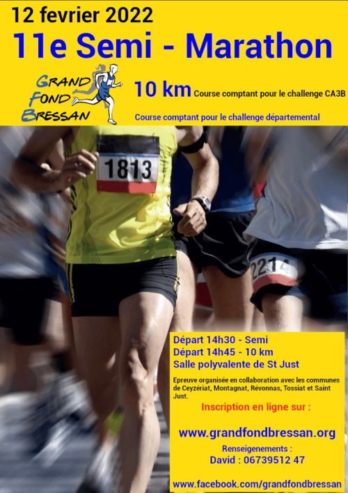 Semi Marathon du Grand Fond Bressan comptant pour le challenge départemental. Avec le concours des municipalités de SAINT-JUST, MONTAGNAT, REVONNAS, et CEYZERIAT.