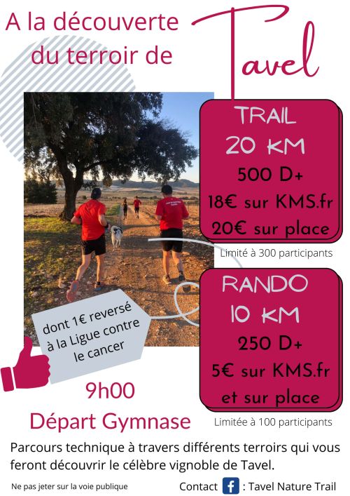 L’association JOG’IN NATURE TAVEL vous convie à son Tavel Nature Trail, un évènement Nature empruntant chemins et sentiers des terres du célèbre vin rosé de Tavel. Tavel Nature Trail, c’est : la valorisation du village de Tavel, son terroir et ses vins, une association à Octobre Rose par le reversement d’une partie de l’inscription.