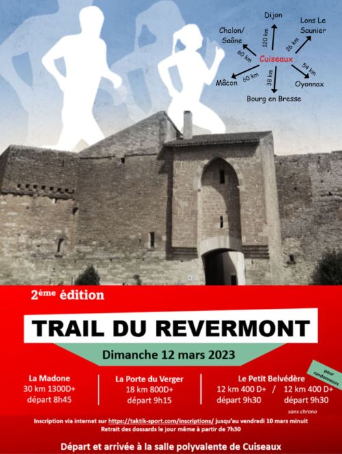 Le Trail du Revermont se décline en 3 courses formant chacune une boucle au départ et à l’arrivée de Cuiseaux et se déroulent en une seule étape à allure libre. Tous les départs et arrivées se font à la salle polyvalente de Cuiseaux, avec possibilité pour les coureurs d’accéder aux douches et sanitaires.