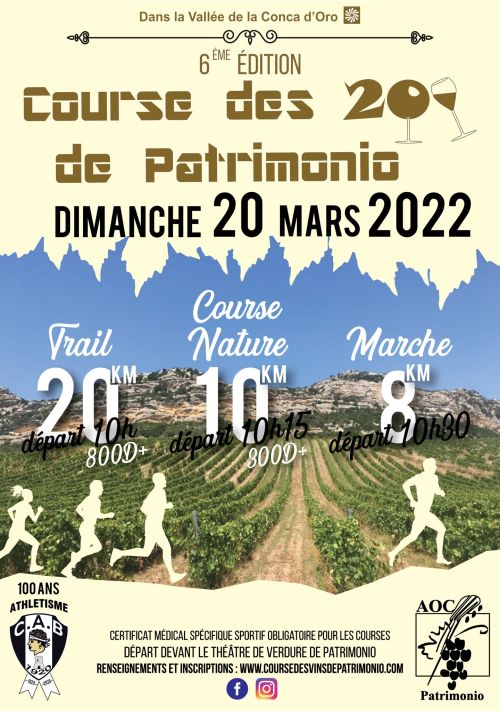 Course des Vins de Patrimonio : 3 parcours (2 courses et une marche) clairement balisés par des flèches résistantes aux intempéries, par des baliseurs sur les points importants et de nombreux rubalises. Buffet convivial de fin de course et nos amis vignerons vous proposerons toujours de déguster leurs productions, échanger avec eux sur leur travail, leur vie, leurs vignobles.