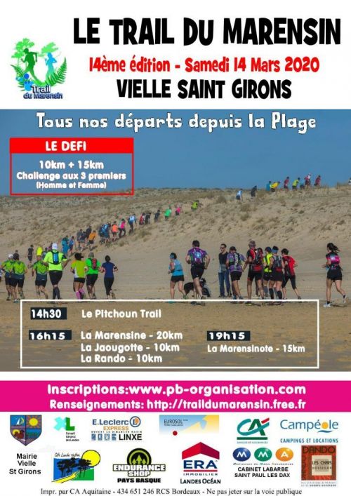 15ème édition du Trail du Marensin. Départ de la plage de st girons et parcours sur les sentiers vallonnés de la forêt landaise. TRAIL 10KM TRAIL 15KM (départ au coucher du soleil) DEFI ; participation au 10km et au 15km RANDO 9km