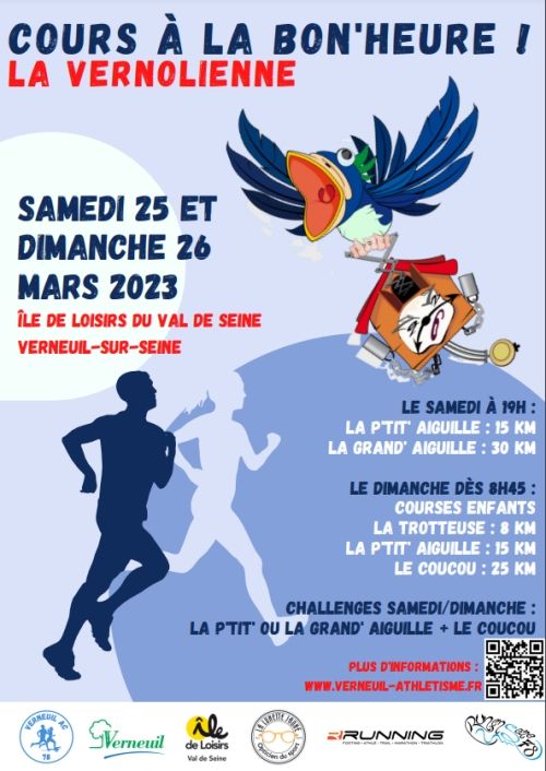 Dimanche à partir de 8h45 LA TROTTEUSE, d’une distance de 8 km ouverte aux (F/H) Cadets Juniors, Espoirs, Séniors, Masters LA P’TIT’ AIGUILLE, d’une distance de 15 km, ouverte aux (F/H) Cadets, Juniors, Espoirs, Séniors, Masters LE COUCOU, d’une distance de 25 km, ouverte aux (F/H) Juniors, Espoirs, Séniors, Masters COURSE 3 KM, ouverte aux Benjamins et Minimes ANIMATION 1, d’une distance de 1000 m, ouverte aux École d’Athlétisme et Poussins ANIMATION 2, d’une distance de 1000 m, ouverte aux scolaires de Verneuil-sur-Seine (écoles élémentaires uniquement)