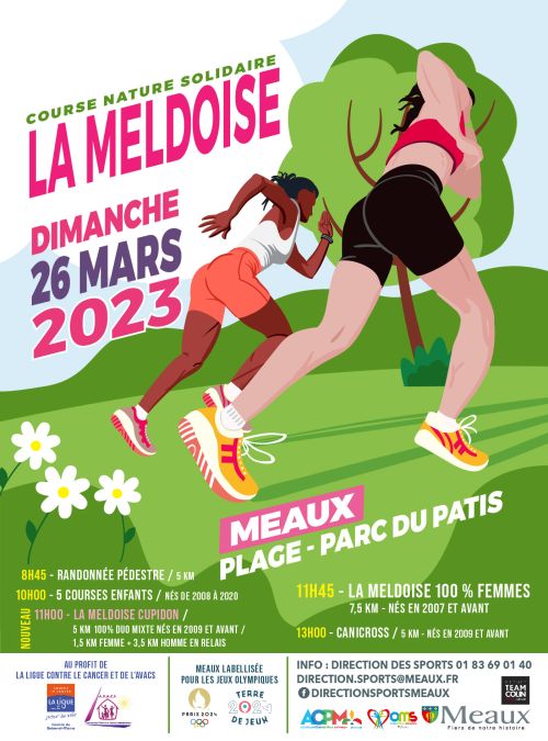 La Meldoise est la course nature solidaire officielle FFA que pour les filles. Elle se déroule sur 7500m depuis la plage de Meaux et dans le magnifique parc naturel du Pâtis. Petits points de bois, étang au cygne, plage de sable fin, pont suspendu, chemin bordant les champs et grande allées longeant La Marne : dépaysement garanti ! La Meldoise est aussi une épreuve solidaire contre le cancer avec versement d’une partie des frais d’ inscription et vente d'objets : chacun est invité à jouer le jeu : coureurs et spectateurs !