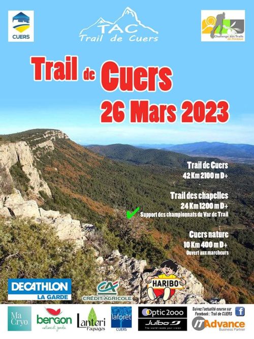 Trail de Cuers. Epreuves limitées à 800 participants toutes courses confondues. Cette année nous vous proposons 3 nouveaux parcours. Le trail de CUERS intègre le CHALLENGE TRAIL DE PROVENCE