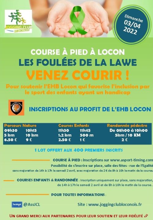 Retrait des dossards : Salle des fêtes de Locon le samedi de 15h30 à 17h30 et le dimanche à partir de 08h00 jusqu'à 15 minutes avant le départ.
