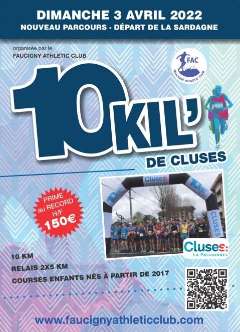 Le "10 kil' de Cluses" est la course organisée par le Faucigny Athlétic Club. Il y en a pour tout le monde : un 10 kms pour les plus affûtés, un relais de 2 x 5 kms pour courir en équipe et des courses enfants à partir de 4 ans (nés en 2013). 10 kil sur route avec départ et arrivee au stade intercommunal.