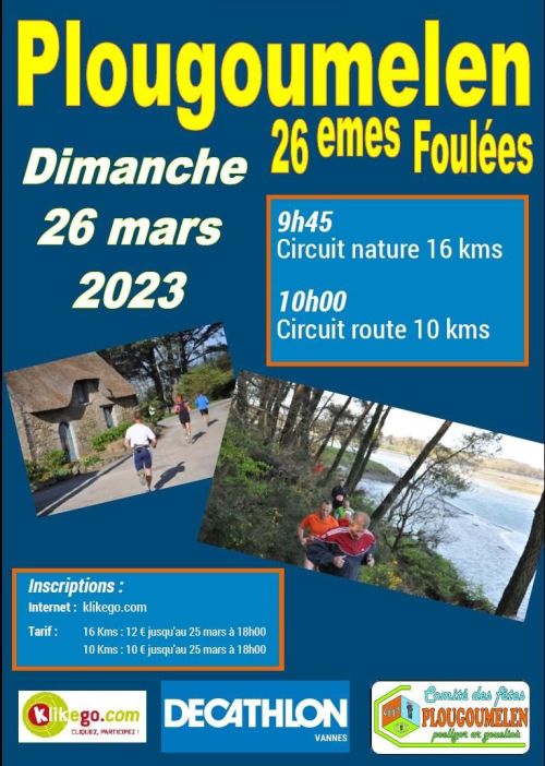 Le comité des fêtes organise les Foulées de Plougoumelen. Le circuit nature de 16 kms vous permettra de découvrir de magnifiques paysages le long des sentiers côtiers et dans le bois de Ponst Sal. Les foulées sur un parcours de 10 kms. Chaque participant recevra un lot, une tombola récompensera les plus chanceux.
