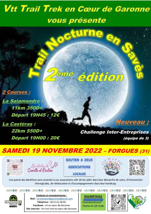 Passez une soirée inoubliable au cœur de la forêt communale de Rieumes au départ de Forgues avec le Trail Nocturne en Savès. Pour ceux qui veulent découvrir un trail de nuit, n’hésitez plus et venez tenter l’aventure. Au cours de la soirée, nous vous proposons deux formats de course permettant à tout le monde de participer, avec cette année, en nouveauté un challenge inter-entreprise (équipe de 3).