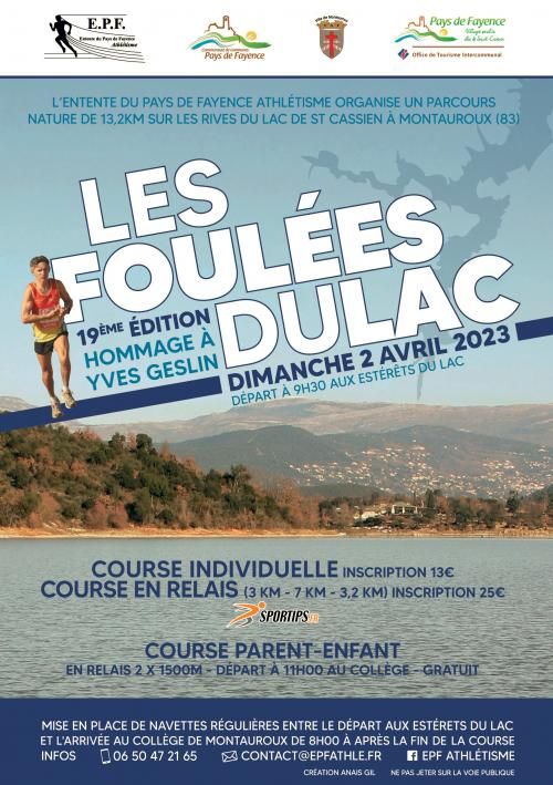 Créée en 2005, la course des Foulées du Lac relie les Estérêts du Lac au collège de Montauroux. Il s’agit d’une course en pleine nature dont le parcours emprunte la rive ouest du Lac de St Cassien. Cette épreuve se déroule principalement sur un large chemin en terre.