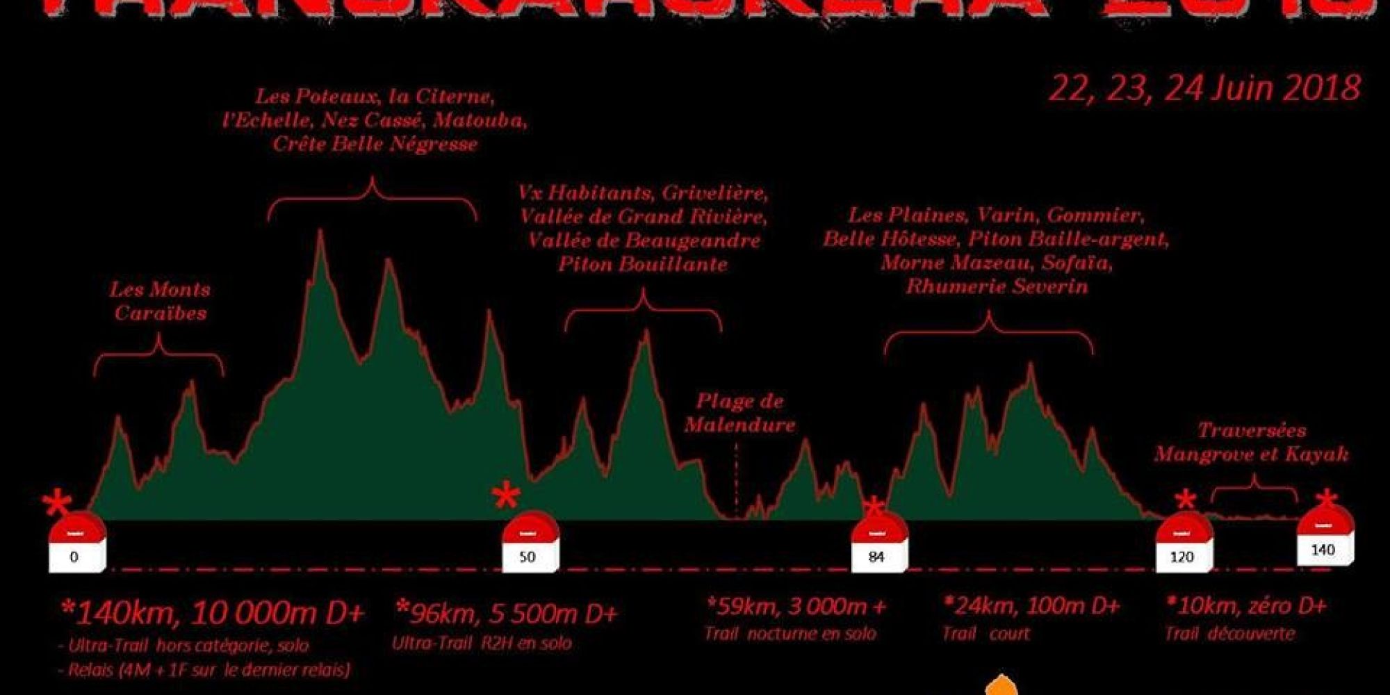 En solo ou en relais par équipe de 5 coureurs. Un Ultra très technique qui vous fera traverser la jungle Guadeloupéenne. Le tracé emprunté comporte de nombreux passages d’une extrême technicité, dans des conditions climatiques pouvant être extrêmement difficiles de nuit et par temps pluvieux, nécessite un excellent entraînement, et une réelle capacité d’autonomie personnelle.