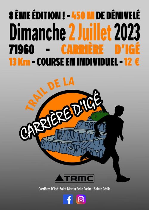 Le Trail de la Carrière d'Igé est une course à pied organisée au nord de Mâcon. Le parcours du trail vous promet une boucle d'environ 13km dans un cadre unique ! L'entreprise TRMC vous propose de découvrir sa carrière et les richesses de ses particularités. Vous pourrez courir à proximité des plus gros engins du département, en profitant d'une vue à couper le souffle le tout dans un parcours des plus divertissants ! Un événement hors du commun pour un public sportif averti qui vous assurera un dépaysement total !
