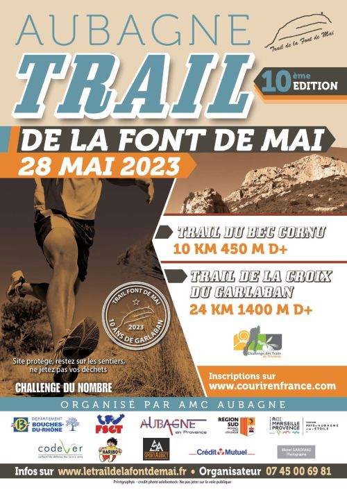 Au cœur du massif du Garlaban, , Le trail de la Font de Mai va offrir aux amateurs de collines provençales 2 courses pédestres de type trail Ces épreuves prennent leur départ à l’entrée du Parc de la Font de Mai à Aubagne et vont mener les participants sur des chemins traversant les communes de Roquevaire, Allauch et Aubagne, sur les sentiers chers à Marcel Pagnol. Un repas complet est prévu pour tous les participants à leur arrivée.