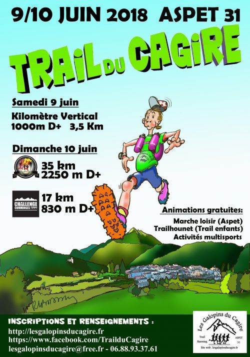 Descriptif du 17Km « Le Trail18 » : Départ du camping d’Aspet (alt.430m), montée sur les prairies de Gèles (alt.651m), le sentier se poursuit sur les granges du Brouca en direction de la ferme de Gaillardet (alt.764m), puis direction Col du Lac et descente sur le Col de Buret (alt.599m). retour sur Aspet avec une variante, on descend en direction d’Izaut Peyregude, puis on remonte sur le hameau de Girosp jusqu'à la fontaine et nous montons par la piste forestière pour retrouver les prairies de Gèles puis descente jusqu'à l’arrivée au stade d’aspet. Cat. autorisées JU->V5.