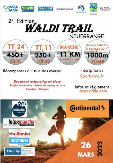 C’est parti pour la 2ème édition du Waldi Trail !🎉 Deux parcours trail de 11 km et 24 km (250 et 450m de d+), ouverts à tous niveaux, au départ de Neufgrange (57910). Une marche populaire de 11km où nous vous attendons aussi nombreux. Et la nouveauté de cette année: une course enfant (1000m) pour que petits et grands puissent en profiter.