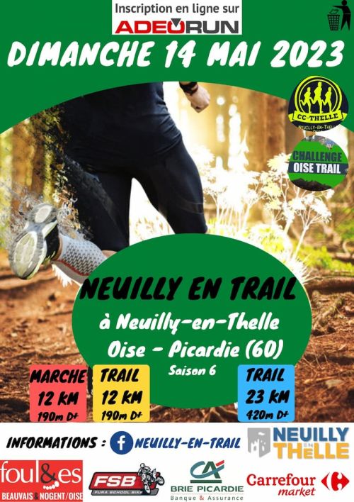 Une boucle de 12 km à travers des chemins et le bois Viville en auto-suffisance, ravitaillement à l'arrivée. Départ 9H30 au départ du complexe sportif Alain Mallon de Neuilly-en-Thelle. Course en faveur de la lutte contre le cancer.