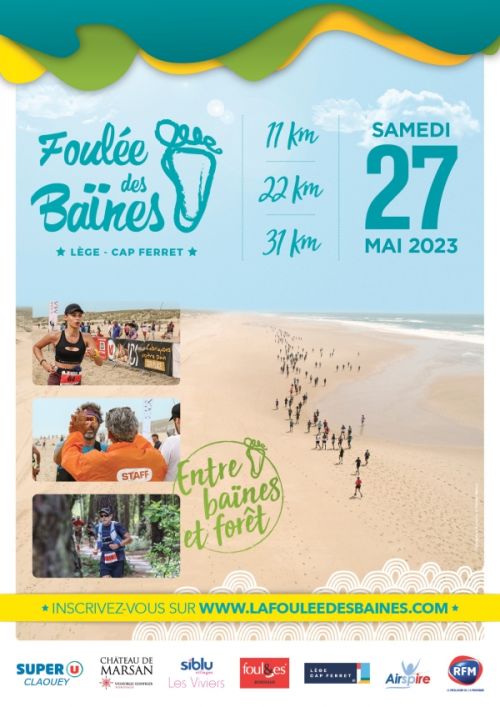 La Foulée des BaÏnes c'est 50 % sable - 50 % Forêt. Départ à 30 minutes de la marée Basse avec un seul ravitaillement à mi-parcours. Tour de cou et bouteille de vin à tous les inscrits.