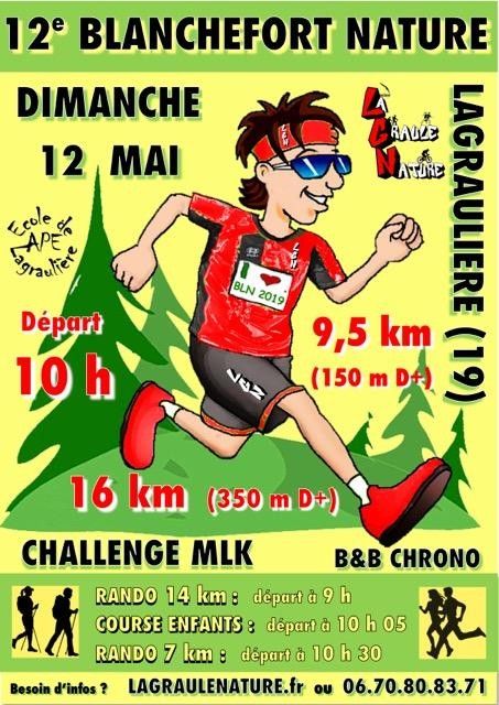 Course Nature empruntant les sentiers de la forêt de Blanchefort de Lagraulière et qui amènera les coureurs le long du ruisseau "Le Brezou". Parcours très agréable et technique. L'inscription comprend : le dossard ; un cadeau aux 200 premiers inscrits ; les ravitaillements et le casse-croûte d'après-course.