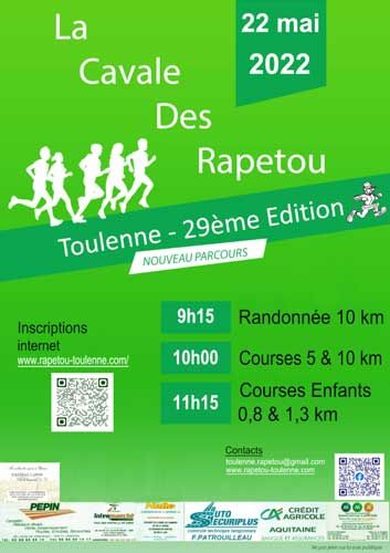 Cette année encore, le club de course des RAPETOU vous attend au complexe sportif de Toulenne pour sa traditionnelle Cavale des Rapetou. Seul, en famille ou entre amis, venez prendre le départ de cette course conviviale ! Des lots attendent les 3 premiers de chaque catégorie…