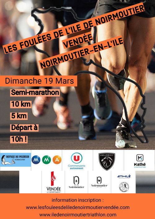 Les Foulées de l'Ile de Noirmoutier Vendée se dérouleront sur la commune de "Noirmoutier-en-l'Ile". Cette manifestations sportive 1ere édition, proposera 3 formats de course. Le semi-marathon étant situé sur le calendrier un mois avant le marathon de Nantes, il rentre parfaitement dans la préparation de ce dernier. Les amateurs comme les professionnels de la course à pied n ont plus qu'à courir sur le 5km, le 10km ou le 21.095km . Ces formats sont donc accessibles au grand public, alors n hésitez plus, inscrivez vous et venez découvrir l'ile de Noirmoutier, ses marais, plages, forêt domaniale, son châteaux, ses ports...