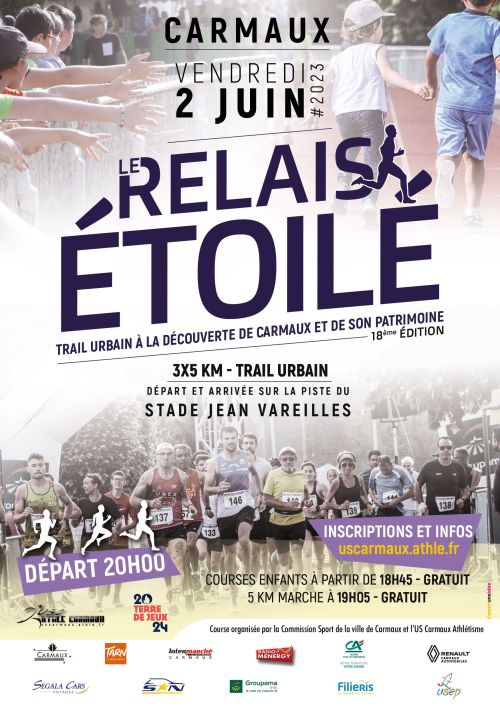 Le Relais étoilé est un trail urbain de 3x 5km sur bitume, chemins, escaliers empruntant, en partie, le PR "Patrimoine et Santé". Ce parcours vous permettra de découvrir les parcs, les monuments et les équipements sportifs de la ville de Carmaux.