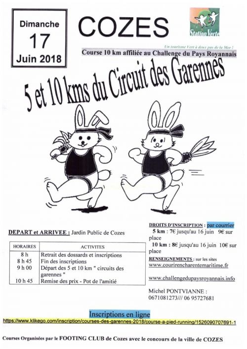 RECOMPENSES: Un lot pour tous les finishers - 10 km et 5 km : - 1 coupe aux 3 premiers hommes et dames - 1 coupe au premier de chaque catégorie - club avec le plus grand nombre de coureurs Course de 10 km inscrite au Challenge du Pays Royannais.