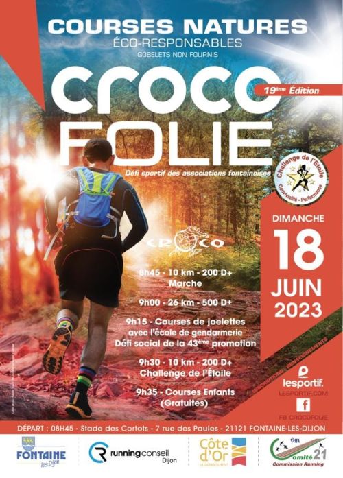 L’association, les Coureurs sur Route de Côte d’Or, CROCO, affiliée à la Fédération Française d’Athlétisme, organise la crocofolie. La crocofolie est une course à pied d’une distance de 26 km environ, qui emprunte les chemins et sentiers autour de la ville de Fontaine les Dijon ainsi que ceux des communes voisines d’Ahuy, de Daix et de Hauteville les Dijon. Le départ sera donné sur le site du gymnase des Cortots.