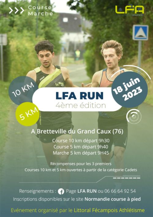 Au programme du LFA Run : Courses 10 km et 5 km (à partir de catégorie Cadet) et marche de 5 KM à Bretteville-du-Grand-Caux. Départ de l'Eglise de Bretteville du Grand Caux