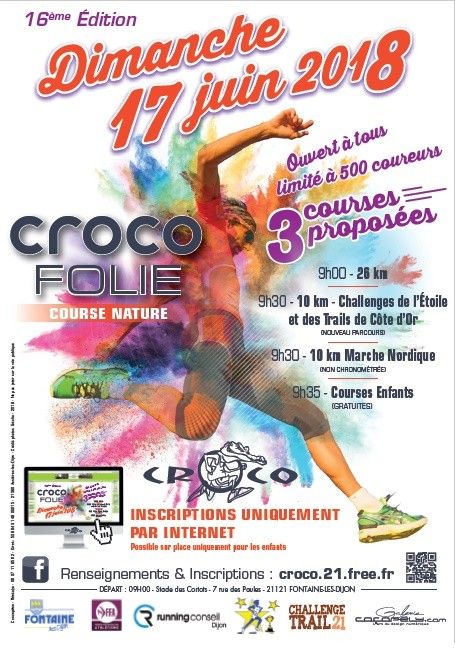 L’association, les Coureurs sur Route de Côte d’Or, CROCO, affiliée à la Fédération Française d’Athlétisme, organise la crocofolie 16ème édition. La crocofolie est une course à pied d’une distance de 26 km environ, qui emprunte les chemins et sentiers autour de la ville de Fontaine les Dijon ainsi que ceux des communes voisines d’Ahuy, de Daix et de Hauteville les Dijon. Le départ sera donné sur le site du gymnase des Cortots.