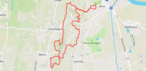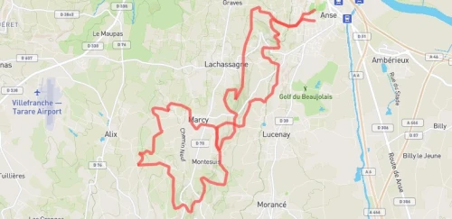 Vous démarrez du centre ville puis il faut grimper jusqu’à Lucenay puis rejoindre le Télégraphe de Marcy en pierres dorées. On reprend des forces au ravitaillement situé à proximité et à partir d’ici vous enchainez des singles à travers bois, des montées et descentes dans les vignes … Enfin bref que du bonheur avec des vues splendides sur les monts du Beaujolais et les Alpes. Ensuite retour par le château de Lachassagne et retour gagnant sur Anse !