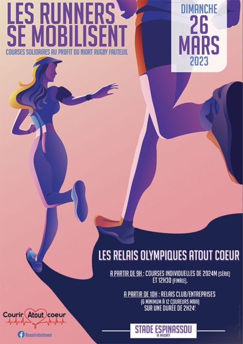 L’association Courir Atout Cœur organise le Dimanche 26 mars 2023 sur la piste du stade Espinassou à Niort une animation autour de la course à pied intitulée »les foulées Olympiques Atout Cœur ». Deux épreuves sur piste vous sont proposées.