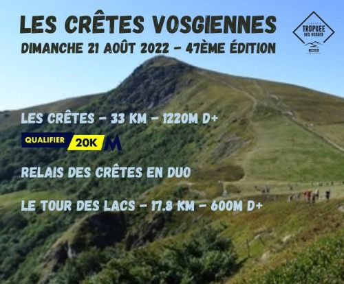 Crêtes Vosgiennes, course de montagne inscrite au Trophée des Vosges et à l'UTMB World Series. Les Crêtes Vosgiennes sont devenues une épreuve mythique dans le monde de la course à pied. L’exigence du parcours et la beauté des paysages ont définitivement établi sa réputation. L’intégralité du parcours emprunte des sentiers pittoresques (GR5) et offre une vue imprenable sur les Vosges et la plaine d’Alsace.