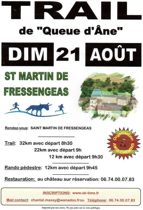 Trail de Queue d'Ane avec un parcours de 30 ou 12 km qui emprunte les chemins des communes de Saint-Jean de Côle / Saint-Martin de Fressingeas /Saint-Romain et Saint-Clément.
