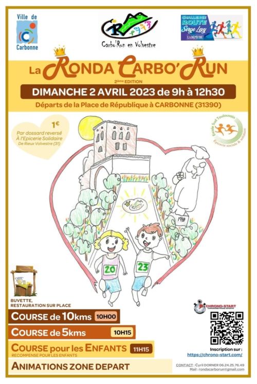 Venez courir sur la Ronda Carbo’Run, course inscrite au CHALLENGE LEVY ROUTE, qui se déroulera au départ de la place de la république à Carbonne (31).