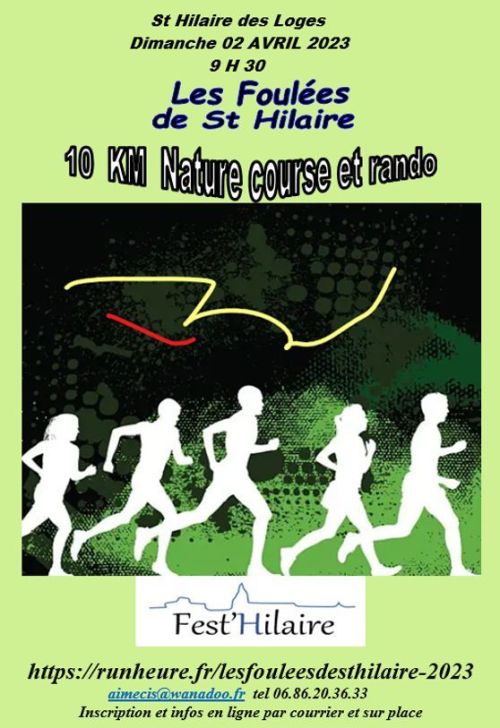 Les Foulées de Saint Hilaire, course sur route : Départ 9h30 et arrivée en face des Halles à St Hilaire des Loges. Distance de 10 km ouverte à tous et à toutes à partir des cadets âgés de 16 ans licenciés FFA et non licenciés. L’Hilairoise, randonnée ouverte sur le même parcours, départ libre à partir de 8H.