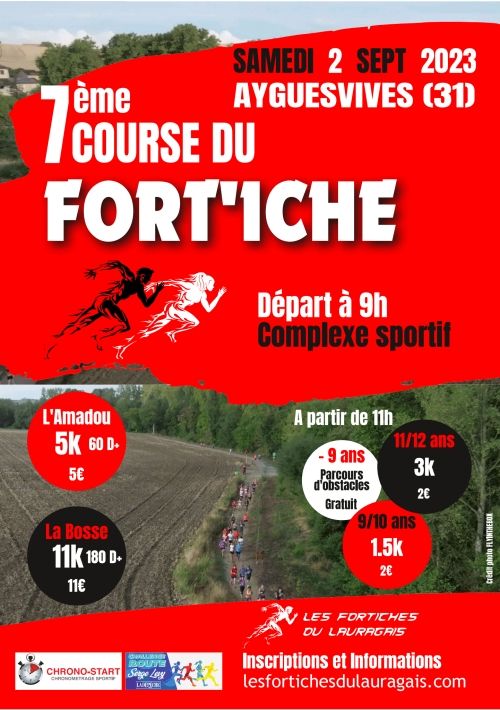 7ème édition de la Course du Fort’iche à Ayguesvives (31) dans le Lauragais ! Les Fort’iches du Lauragais proposent deux parcours nature (40% chemin / 60% route) mettant en valeur Ayguesvives : - L’Amadou (5 km), une boucle entre le canal du Midi et le parc de la mairie, - La Bosse (11 km), une extension de l’Amadou pour découvrir les hauteurs du village. La Bosse fait partie du Challenge Levy Route 2023. Côté enfants, il y aura le traditionnel et très attendu parcours d’obstacles pour les plus petits (moins de 9 ans). Pour les plus grands, on reconduit la formule gagnante de l’an dernier, avec des parcours de 1,5 km (9 et 10 ans) et 3 km (11 et 12 ans).