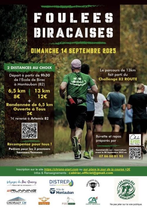 Les Foulées Biracaises, organisées à Montauban, invitent coureurs et marcheurs à découvrir le quartier de Birac. Avec deux courses (6,5 km ou 13 km) et une randonnée de 6,5 km, le parcours traverse des chemins variés, mêlant routes et sentiers à travers les paysages verdoyants de Fustié, Adien-Prax-Paris, Gascous, Bonnefond et Lamothe. Venez participer à cet événement convivial et solidaire, accessible à tous les niveaux !