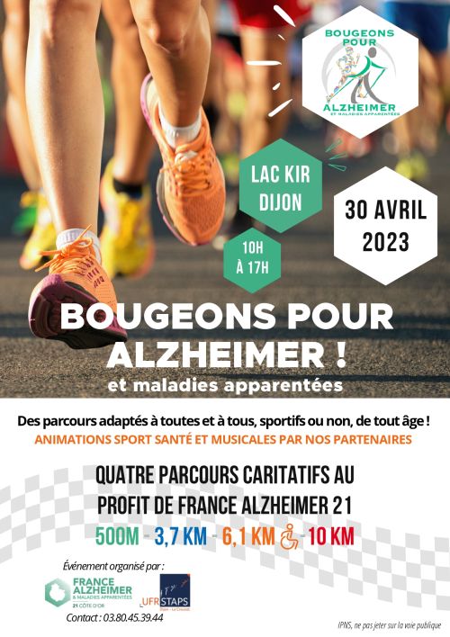 France Alzheimer Côte-d’Or, en collaboration avec la filière STAPS de l’Université de Bourgogne, organise une manifestation caritative et sportive au lac Kir à Dijon. Ce grand événement, créé en 2022, vise à valoriser l'action physique pour tous et particulièrement avec l'avancée en âge. Les événements festifs permettent de véhiculer des messages forts et sensibiliser davantage ! Ensemble, bougeons le regard sur cette maladie et vivons ensemble la solidarité. Ouvert à toutes et à tous, seul ou en famille, sportif ou non. Quatre parcours sportifs : Le matin 2 courses compétitives chronométrées, avec départ vers la base nautique et arrivée au Village France Alzheimer : Course 10 km, départ 10h00 Course 6,1 km, départ 11h30 L’après-midi à partir de 14h00 : Un parcours course ou marche détente (500 m), un parcours course ou marche (3,7 km. Vous pourrez aussi retrouver au Village Animations à partir de 10h00 : bistrot musical, initiation au tango, initiation au ping-pong adapté, atelier équilibre, stand d'information, tombola... Pour les courses, inscriptions en ligne et renseignements : https://www.finishers.com/book/event/n7mdP