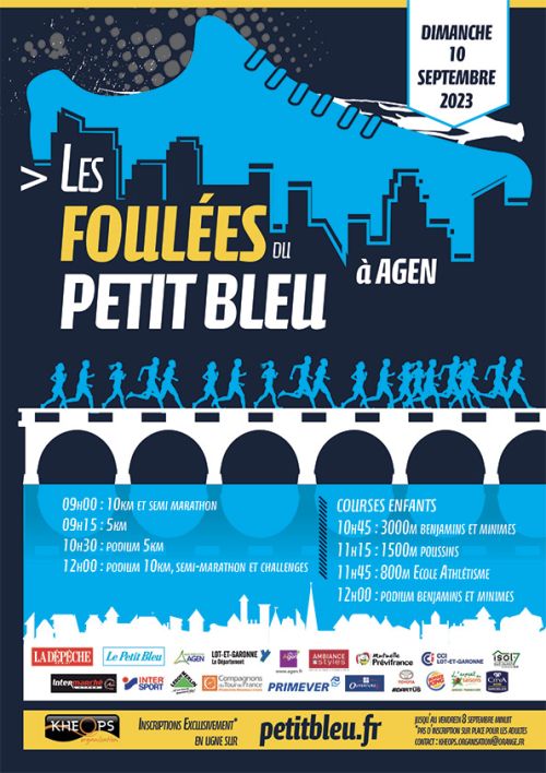 Le coeur d’Agen va battre au rythme des Foulées martelant l’asphalte. Trois Grand’Bleu dont les départs et les arrivées se feront sur l’esplanade du Gravier sont au menu. Dès 9 heures , s’élancera un 5 kilomètres réservé aux femmes et aux hommes nés en 2004 et avant. Puis à 10 h 30, partira, lors d’un départ commun sur un parcours officiellement mesuré un 10 kilomètres et un Semi-Marathon, pour les participants nés en 2002 et avant pour le 10 kilomètres, et nés en 2000 et avant pour le Semi-Marathon. Des catégories Minimes à Vétérans 4, des femmes aux hommes, des premiers aux troisièmes, ce sont plus de 120 participants qui seront honorés. Un Challenge Entreprise et un Association/Club viendront récompenser l’implication du tissu économique et sportif dans les Foulées du Petit Bleu.