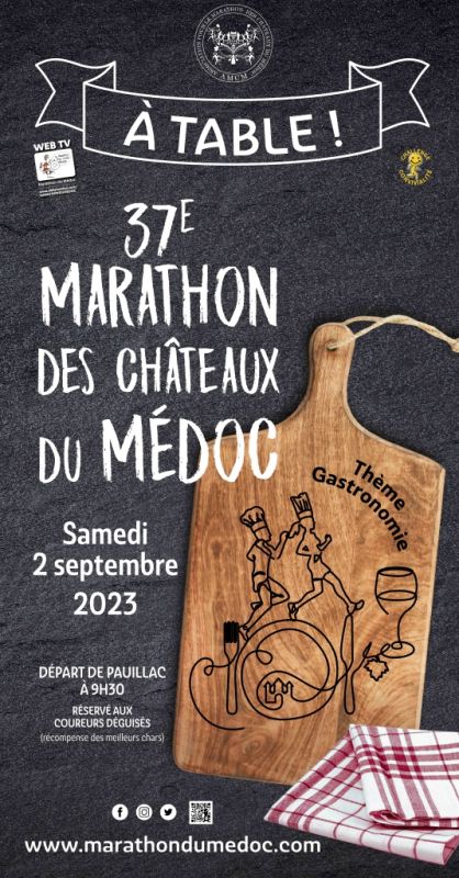 « Le Marathon des Châteaux du Médoc fait son Cinéma » sera le thème du prochain marathon des châteaux du Médoc à Pauillac. 8 500 concurrents venant du monde entier goûteront à la 36e édition du Marathon des châteaux du Médoc. Le « Médoc », course unique en son genre parmi les autres épreuves, mêle avec succès dégustations de grands crus, animations et déguisements sur un parcours traversant les appellations prestigieuses.