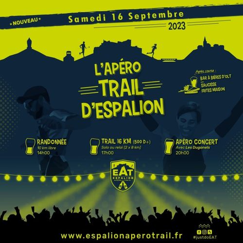 L’APERO TRAIL D’ESPALION Le 16 septembre 2023, journée du patrimoine, le premier Trail d’Espalion sera lancé à 17h !! Un circuit de 16km patrimonial (église de Perse, château de Calmont) qui offrira les plus belles vues d’Espalion (Vermus, Calmont, Alayrac), en passant par des sentiers mythiques (GR65, voie verte). 3 formules proposées :