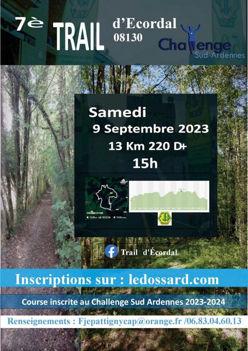 Une seule boucle de 13 km. Un ravitaillement. Inscriptions possibles sur place, salle des fêtes d'Ecordal à partir de 13h. Résultats à 17h45. Catégories autorisées CA->V5.