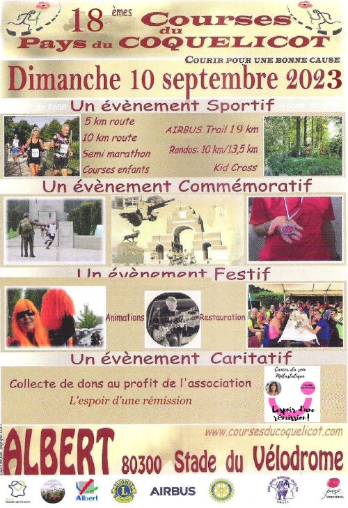 La 18ème édition des courses du Pays du Coquelicot est organisée par l’A.M.P.C (l’Association du Marathon du Pays du Coquelicot) sous l’égide de la Ville d’Albert et avec le concours du club régional d’athlétisme AMAAC et propose cette année 4 courses. adultes , 2 épreuves enfants et 2 marches loisir.