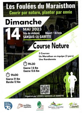 Course nature 12,2 km 12 kilomètres à effectuer au coeur du Marais Poitevin sur un parcours nature. Départ 10 h30. Départ et arrivée à Sansais La Garette