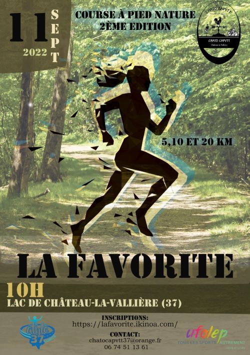 La Favorite organisée par l'association CHATO CAPVTT qui a pour objectif de réunir des sportifs aguerris ou novices autour de deux activités, la course à pieds et le VTT. Avec trois parcours 5,10 et 20 km autour du lac et en forêt de CHATEAU LA VALLIERE. Des parcours 100% nature!