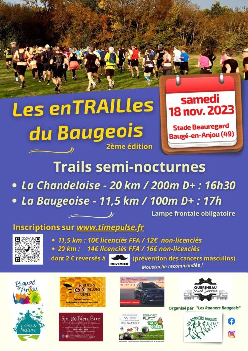 Course Nature, Semi Nocturne organisée le Samedi 18 Novembre 2023. Départ en fin d'après midi du complexe sportif Bauregard de Baugé en Anjou (49150) Deux distances proposées 11 et 20 kms Course en soutien au mouvement Movember pour la prévention des cancers masculins.