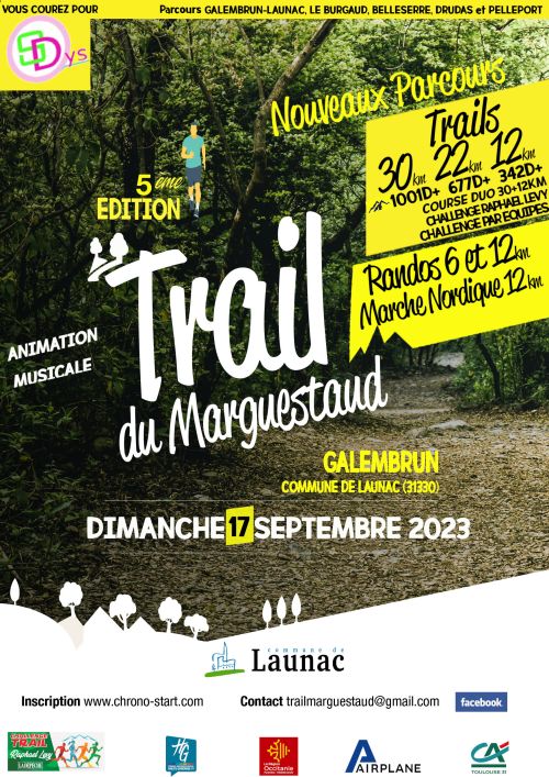 Le Marguestaud, c’est une petite rivière qui coule paisiblement du côté du petit village de Galembrun, commune de Launac. C’est aussi le nom du bar de la place des Acacias au centre du village où nous vous accueillerons avec grand plaisir. Cette place est le lieu du départ et de l’arrivée des différentes formules : trail, randonnée pédestre et marche nordique. C’est également là que nous vous proposerons de passer un moment convivial après la course pour vous restaurer ou simplement refaire la course entre amis autour d’un verre.